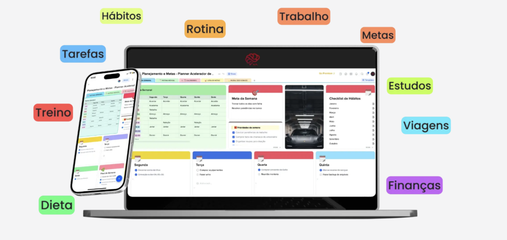 Sim. Dá pra organizar desde estudos e trabalho até finanças e autocuidado — tudo no mesmo lugar.